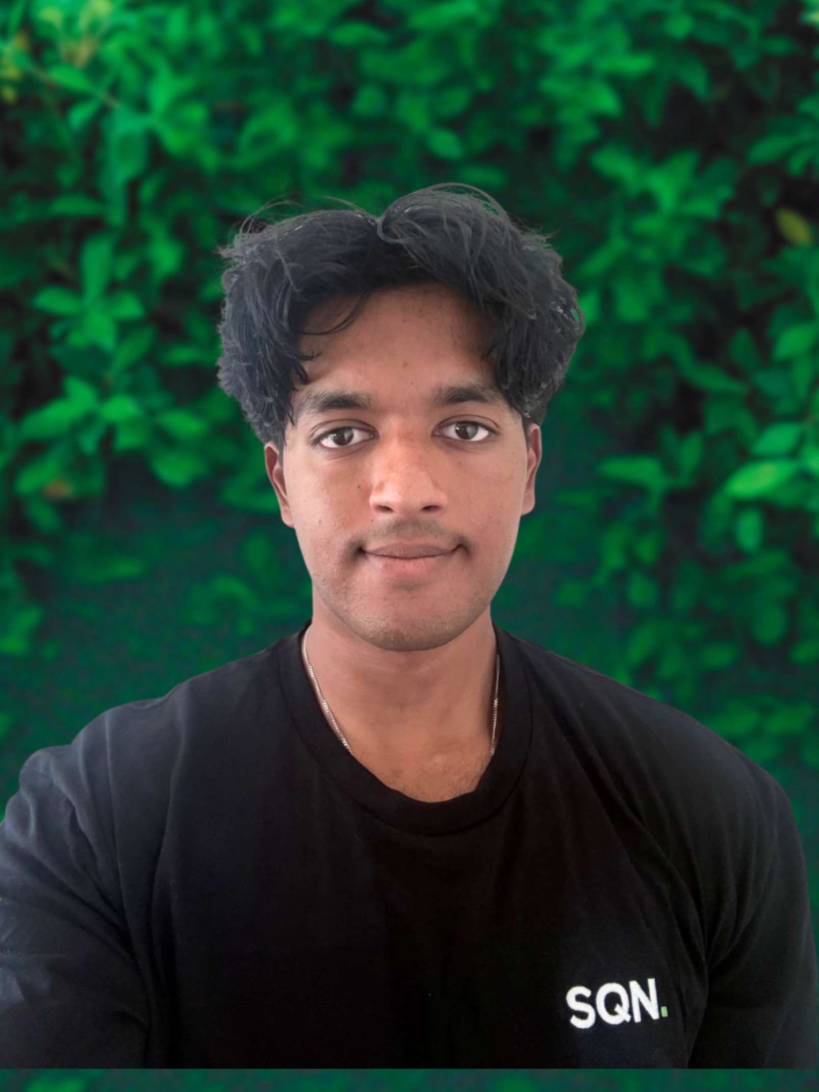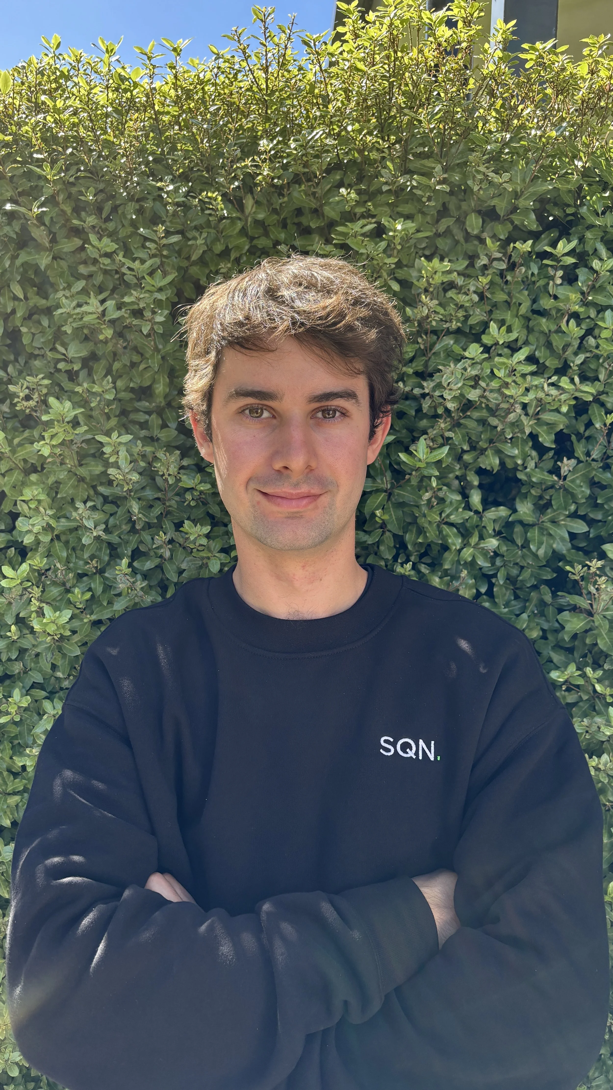 • A smiling man with crossed arms, wearing a navy polo shirt with 'SQN' logo, standing outdoors in front of green foliage.